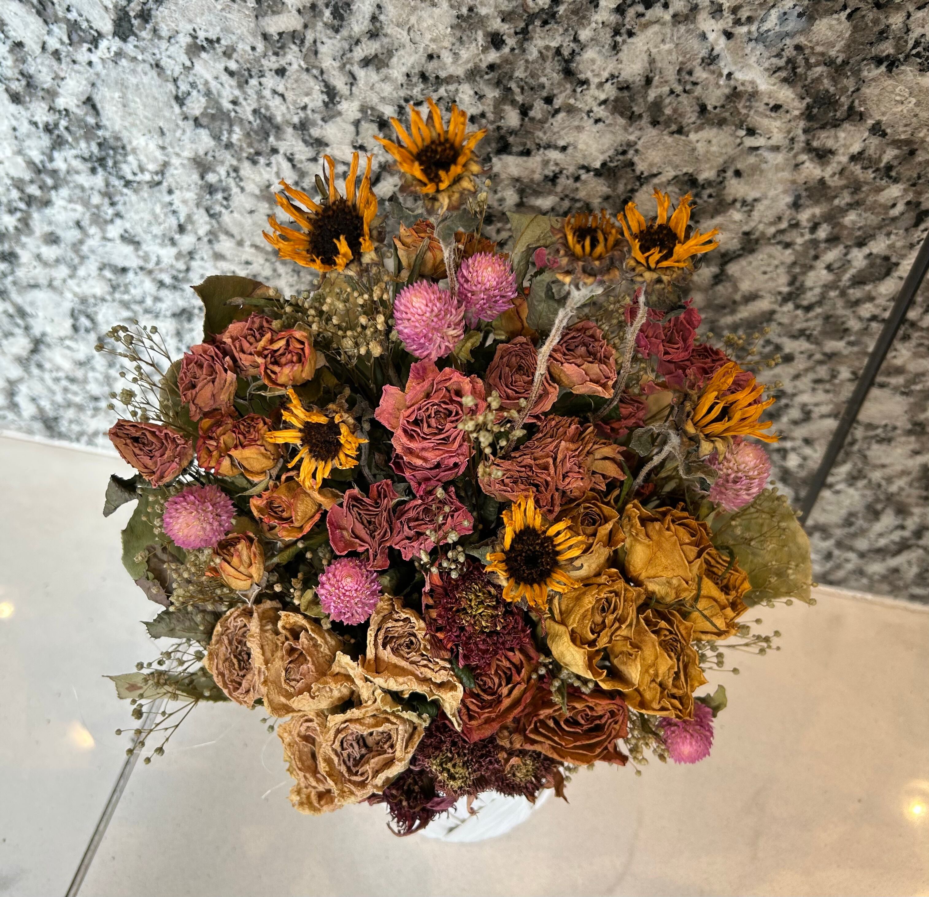 花材: ドライフラワー(バラ、ミニバラ、ひまわり、エキナセア、千日紅、レモンリーフ、プリザーブドフラワーの霞草など)