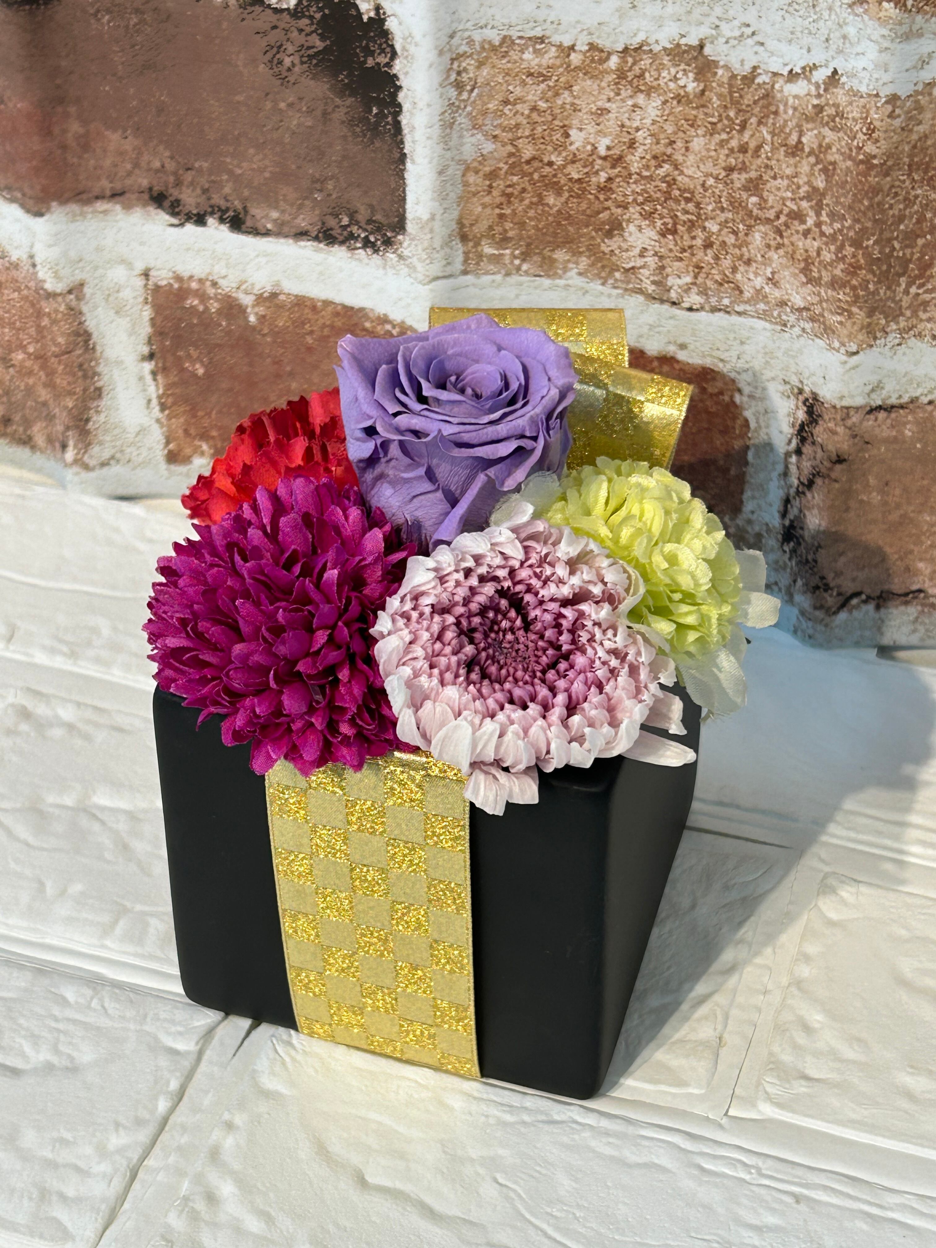 プリザーブドフラワー 和スクエアアレンジは、落ち着いた雰囲気の中に華やかさをもたらす一点物です和と洋の融合テイストを感じられるアレンジは、年齢層幅広い贈答用にも、インテリアを彩るアイテムとしてもお勧めの一品です