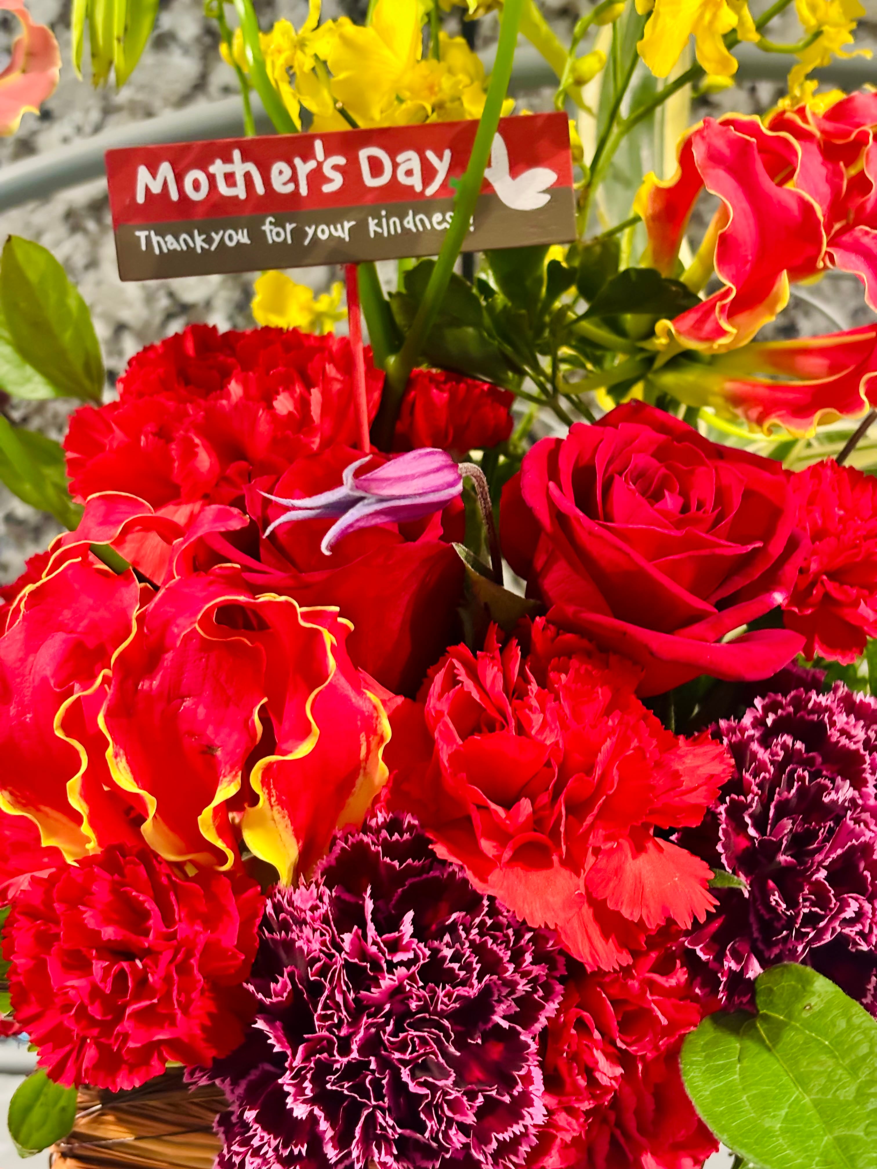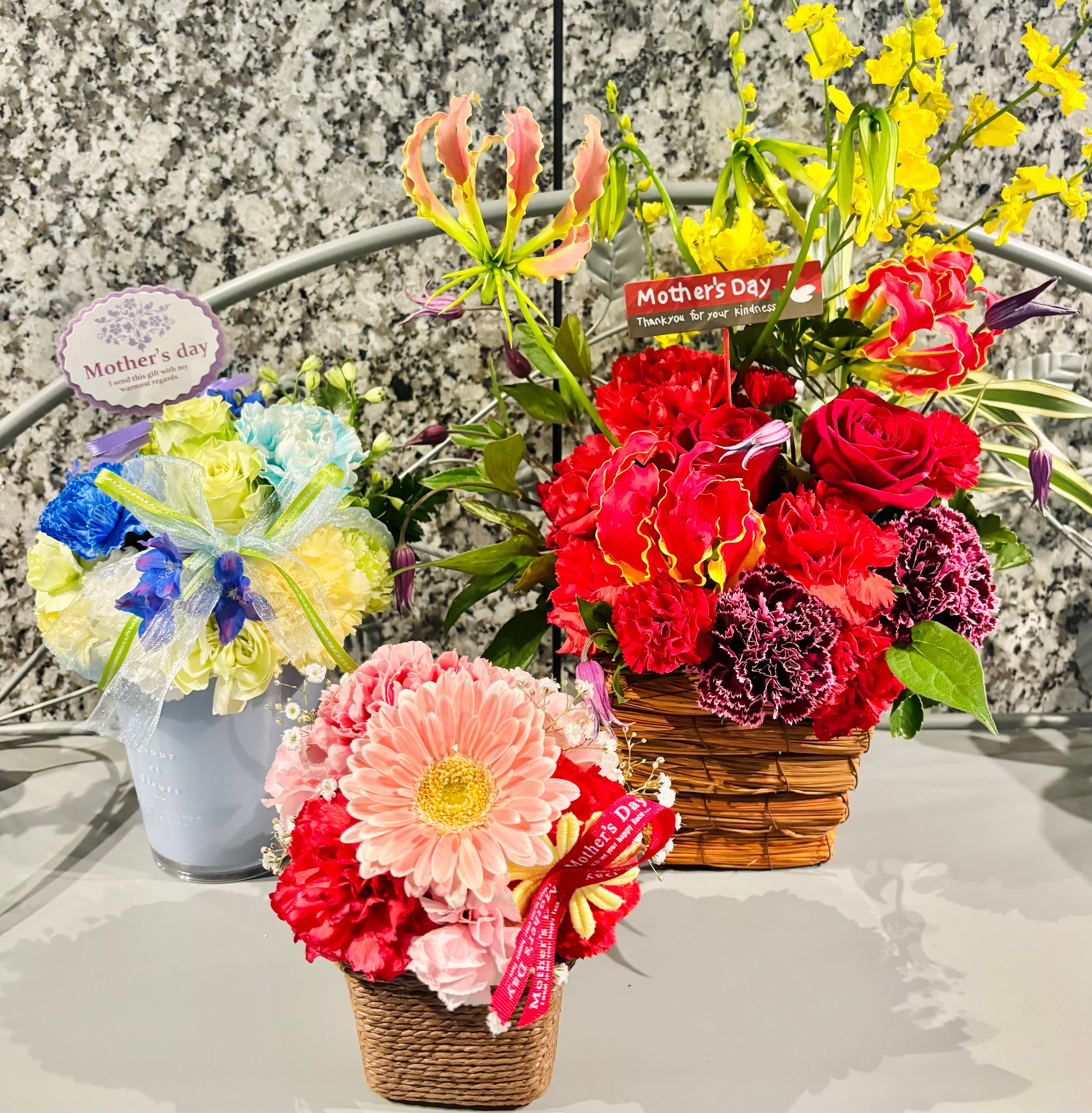 鮮やかな赤系のカーネーションとバラに贅沢に蘭を添えたワンランク上のアレンジメント