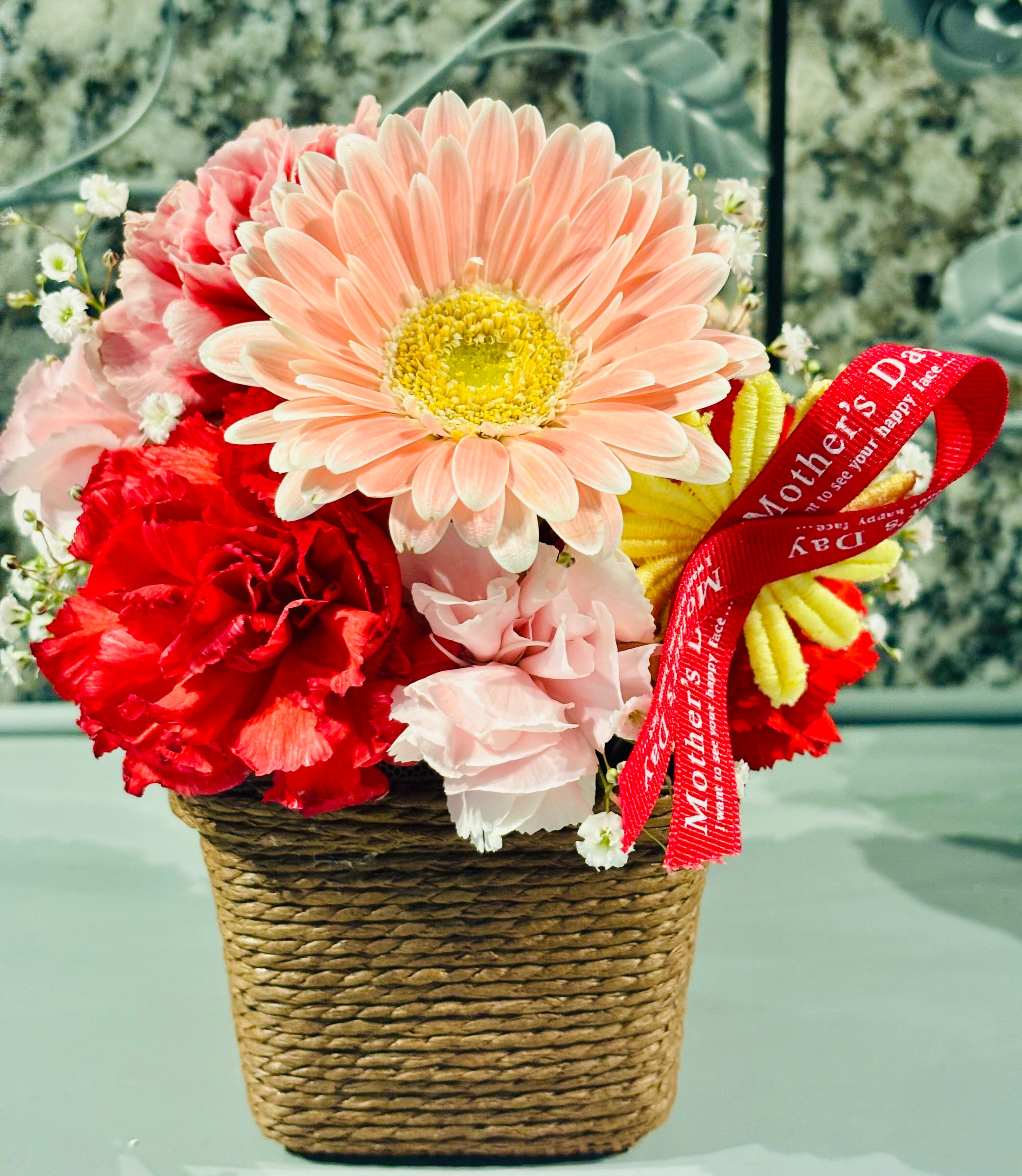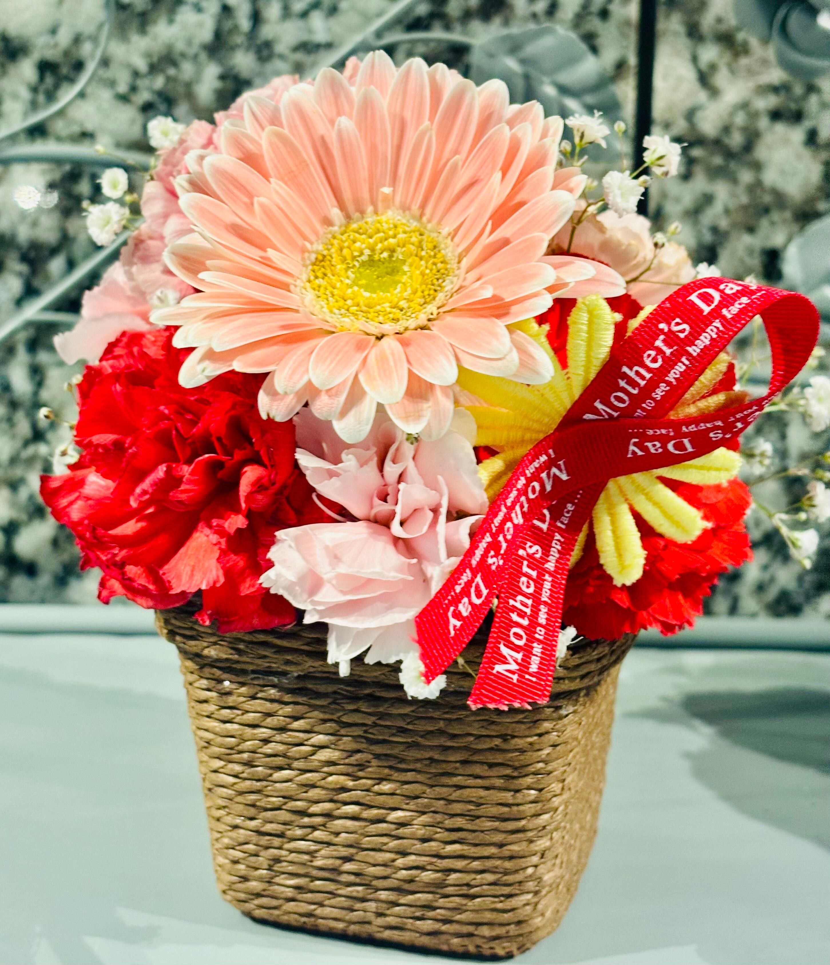 母の日に贈るカーネーションとピンクのガーベラ、霞草でふんわり可愛いアレンジです
