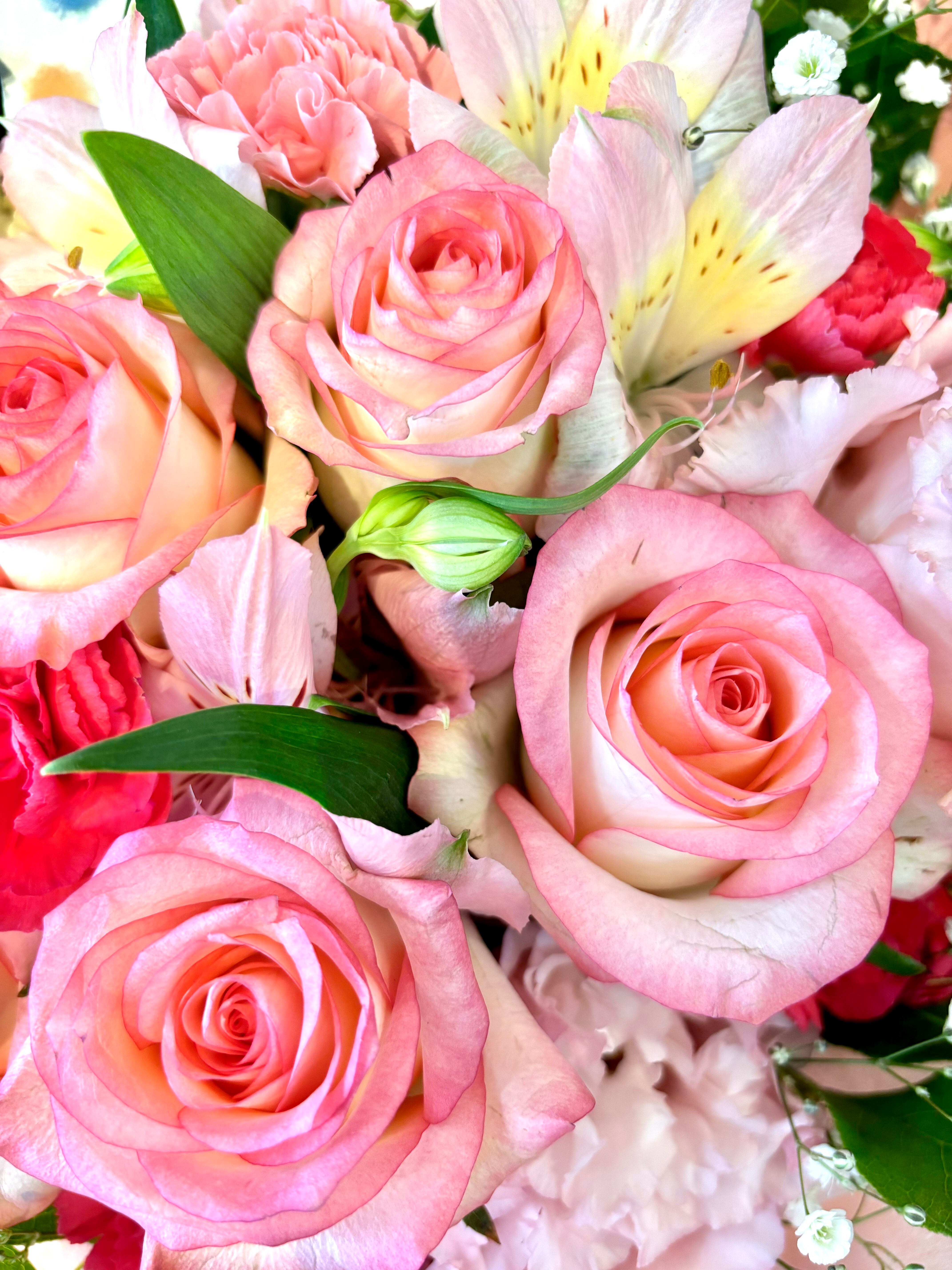 花材:バラ、カーネーション、トルコ桔梗、アリストロメリア、かすみ草、レモンリーフ他